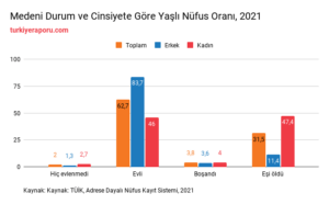 Yaşlı nüfusun medeni durumuna bakıldığında yaşlı erkek nüfusun %1,3’ünün hiç evlenmediği görülüyor. Yaşlı erkeklerin %83,7’si resmi nikahla evliyken %3,6’sı boşanmış ve %11,4’ünün ise eşi ölmüş. Yaşlı kadınların %2,7’si hiç evlenmemiş, %46’sı resmi nikahla evli, %4’ü boşanmış ve %47,4’ünün eşi ölmüş. Burada, eş ölümleri arasındaki büyük fark göze çarpıyor. Eşi ölen kadınların oranı eşi ölen erkeklerin neredeyse 4 katı.