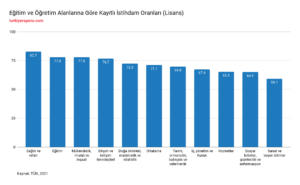 Raporda yer alan verilere göre, lisans mezunlarının istihdam edilme oranı %71,1 iken ön lisans mezunlarında oranı ise %63. Lisans mezuniyetlerine bakıldığında en çok istihdamın %82 ile sağlık ve refah alanında olduğu görülüyor. Bunu %77,8 ile eğitim ve mühendislik, imalat ve inşaat alanları takip ediyor. Bilişim ve iletişim teknolojileri %76,7 ile dördüncü sırada yer alırken doğa bilimleri, matematik ve istatistik %72,3 ise beşinci sırada. Türkiye ortalamasının altında kalan alanlar ise %69,8 ile tarım, ormancılık, balıkçılık ve veterinerlik. İş, yönetim ve hukuk alanı da %67,4 ile ortalamanın altında. İstihdam oranının en düşük olduğu alan ise %59,1 ile sanat ve beşeri bilimler. Ön lisans alanında ise en yüksek istihdam mühendislik, imalat ve inşaat alanında. %71,3 ile ön lisans seviyesinde birinci alan olan bu bölüm lisans seviyesinde daha geride. Ön lisans seviyesinde ikinci olarak ise %66 ile tarım, ormancılık, balıkçılık ve veterinerlik geliyor. Bunu %65,8 ile bilişim ve iletişim teknolojileri takip ediyor. Ardından %65,2 ile doğa bilimleri, matematik ve istatistik ve %64,3 ile iş, yönetim ve hukuk alanı geliyor.