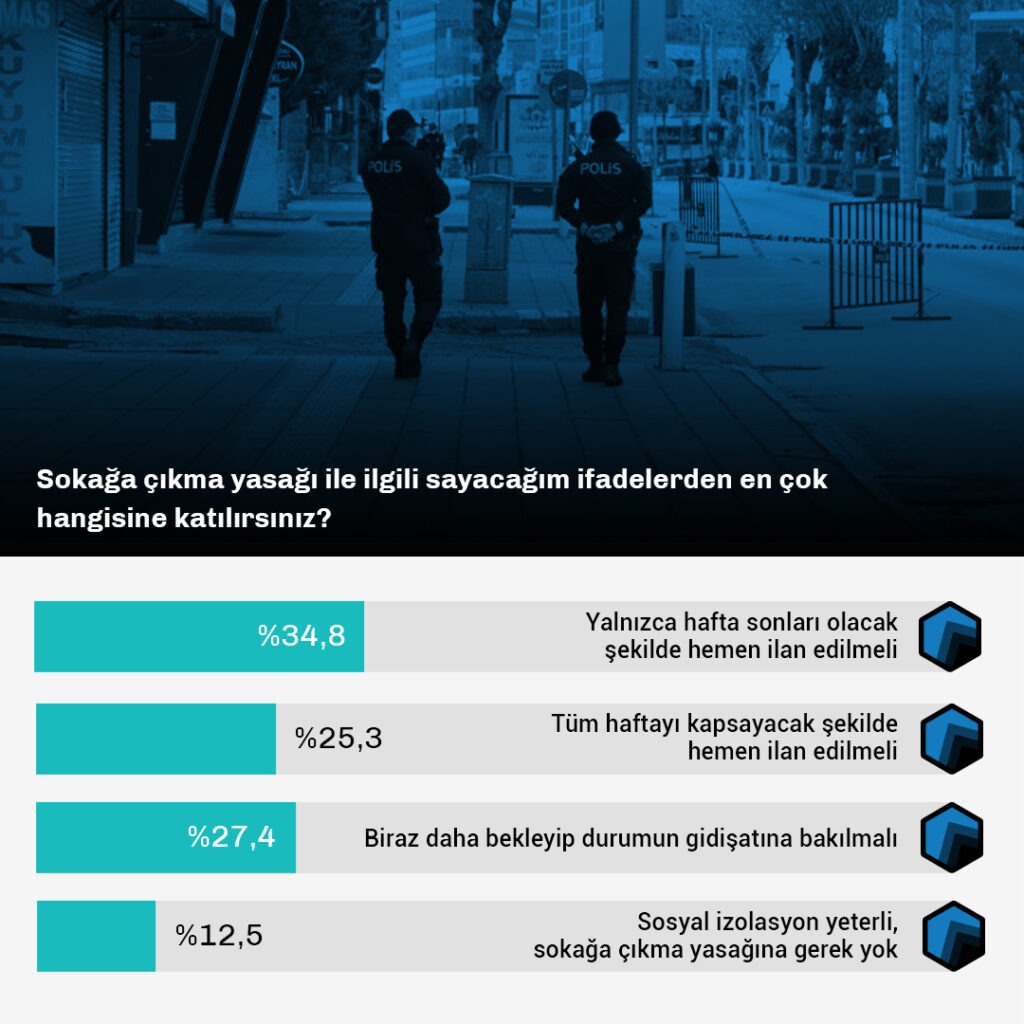 Toplumun sokağa çıkma yasağı ile ilgili görüşlerini daha iyi anlamak adına olası bir sokağa çıkma yasağının nasıl olması gerektiğini katılımcılarımıza sorduk. Katılımcıların toplamda %60’ı hemen sokağa çıkma yasağı ilan edilmesi gerektiğini düşünüyor. Benzer bir soruyu Nisan ayında ilk sokağa çıkma yasağı ilan edilmeden önce sorduğumuzda %45 “Hemen ilan edilmeli” yanıtını vermişti. Katılımcıların %34,8’si sokağa çıkma yasağının sadece hafta sonlarını kapsayacak şekilde hemen ilan edilmesi gerektiğini savundu. Her 4 katılımcıdan 1’i (%25,3) sokağa çıkma yasağının tüm haftayı kapsayacak şekilde ilan edilmesi gerektiğini belirtti. %27,4 biraz daha bekleyip durumuna gidişatına bakılması gerektiğini söyledi. Ankete katılanların sadece %12,5’i sosyal izolasyonun yeterli olduğunu ve sokağa çıkma yasağına gerek olmadığını belirtti.