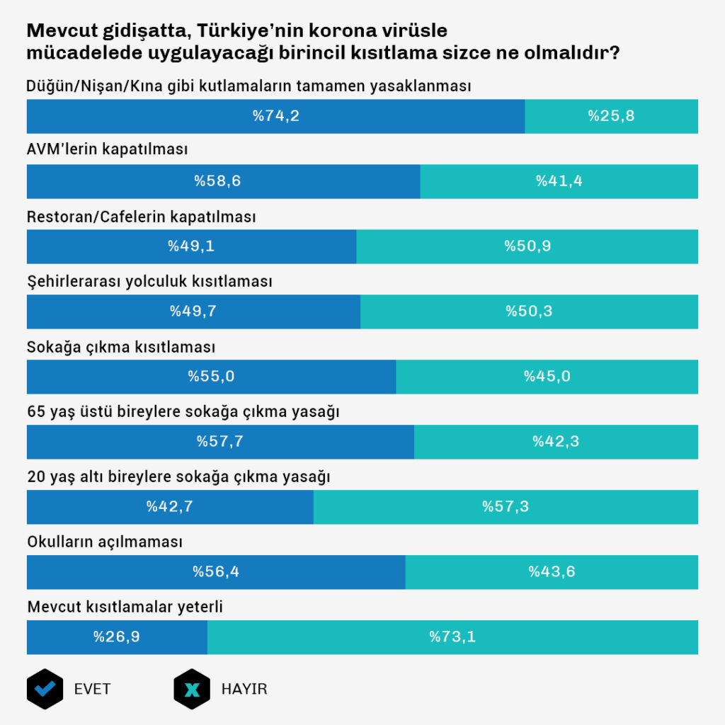 Katılımcıların %74,2’si Koronavirüs ile mücadele çerçevesinde düğün, nişan ve kına gibi kutlamaların tamamen yasaklanması gerektiğini savundu. Ankete katılanların yarısından fazlasının onayladığı diğer ifadeler ise AVM’lerin kapatılması (%58,6), 65 yaş üstü bireylere sokağa çıkma yasağı (%57,7), okulların açılmaması (%56,4) ve sokağa çıkma kısıtlaması (%55) oldu. Restoran ve cafelerin kapatılması ifadesi ile şehirlerarası yolculuk kısıtlaması ifadesi katılımcıları ikiye bölmüş gibi duruyor. Salgın ile mücadelede mevcut kısıtlamaların yeterli olduğu ifadesine ise %73,1 katılmadığını belirtti.
