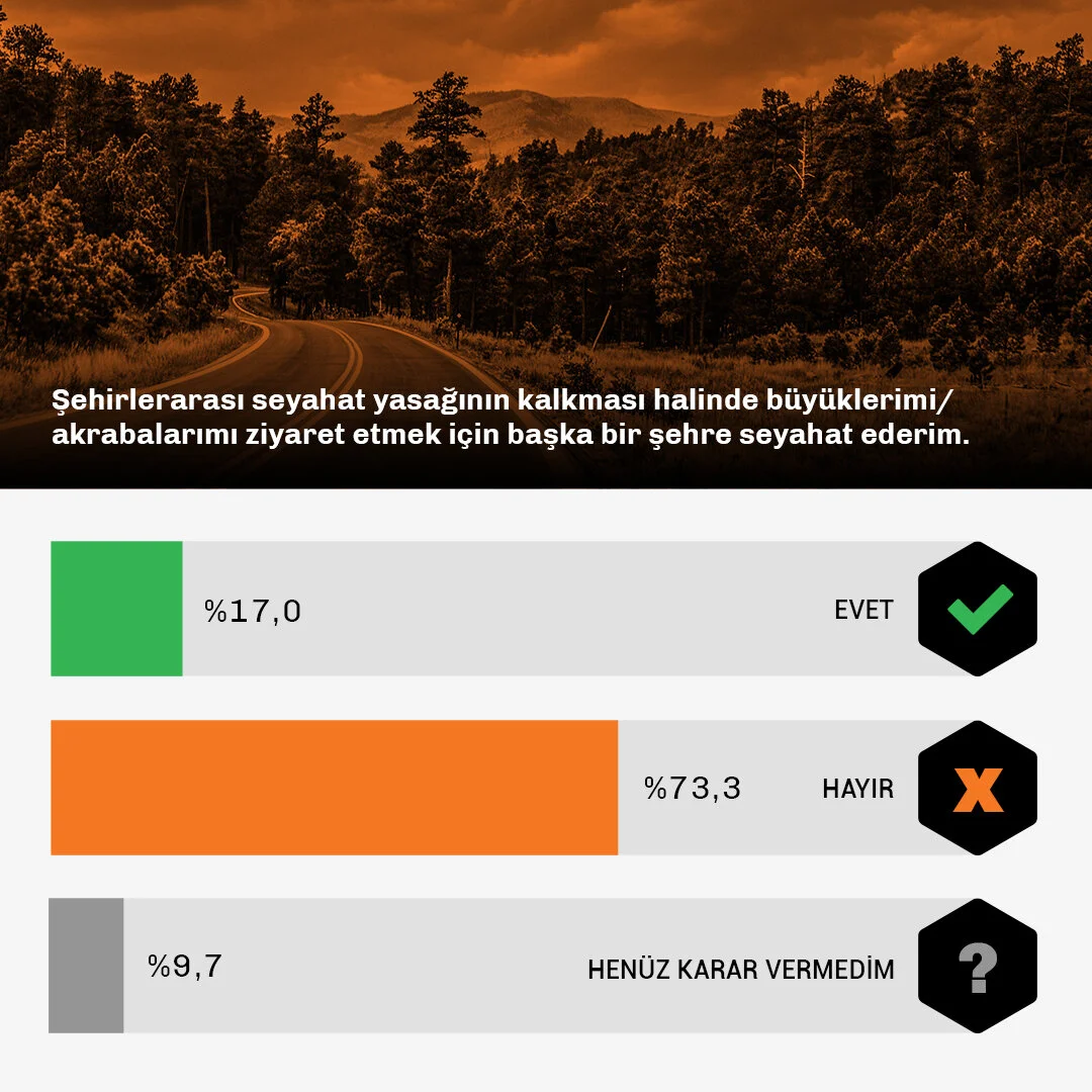 Mayıs ayının başında, Cumhurbaşkanı Erdoğan’ın Pazartesi günü yaptığı açıklamalardan hemen önce düzenlediğimiz ankette katılımcılara “Şehirlerarası seyahat yasağının kalkması halinde büyüklerimi/akrabalarımı ziyaret etmek için başka bir şehre seyahat ederim.” ifadesine katılıp katılmadıklarını belirtmelerini istedik. Sonuçlara göre katılımcıların %17’si bu ifadeye katılırken, %73,3’ü bayram ziyareti için şehir dışına seyahat etmeyi planlamadıklarını belirtti. Son olarak katılımcıların %9,7’si bu konu hakkında henüz bir karar vermediklerini ifade etti.